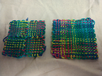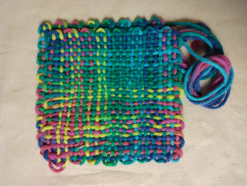 Some of the continuous strand methods I use utilize the edge finishing techniques from the potholder weavers. Also if you are looking for unique color patterns, this is a style to follow.