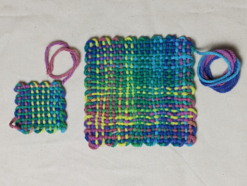 The size of the weavie produced by a loom will be slightly smaller than the loom due to yarn shrinkage and how tightly woven the weavie is. As you get more familiar with this style of weaving you will work out the right tension for you.